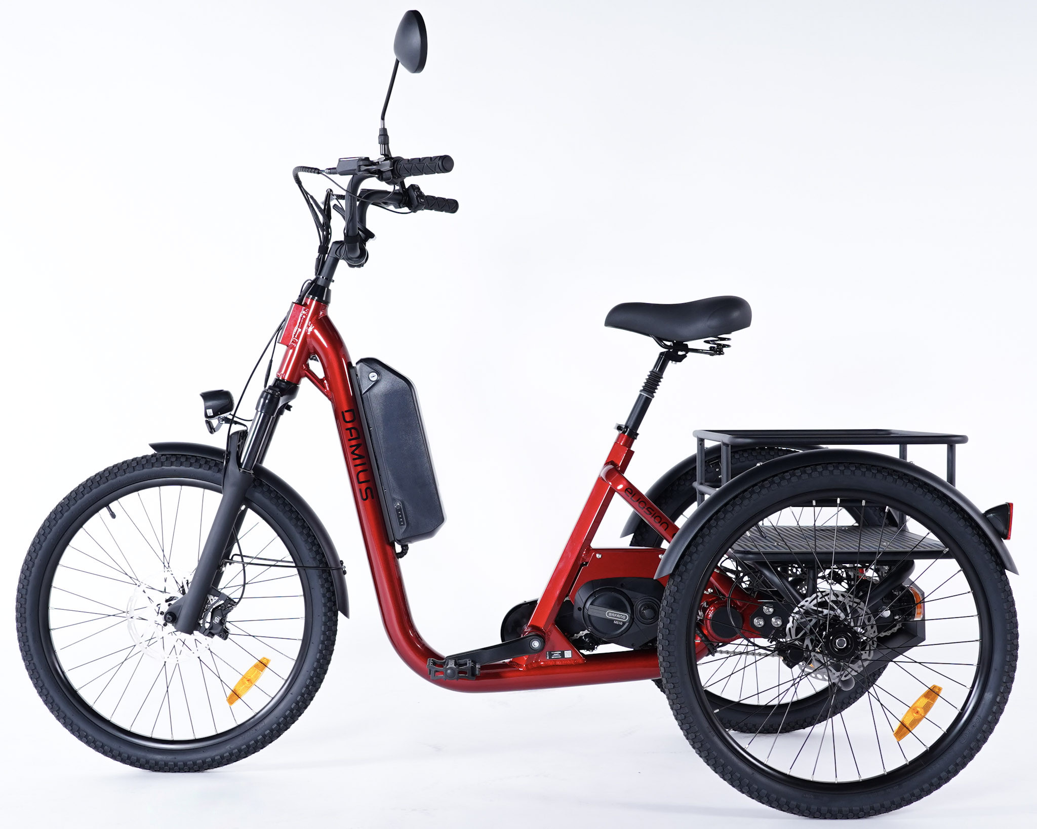 Et puisque c'est un Evasion et que c'est aussi un Damius, vous retrouverez sur ce modèle un enjambement ultra bas afin de faciliter l'accès et il est équipé d'un grand nombre d'équipements d'origine comme le rétroviseur, l'antivol de cadre permettant de bloquer la roue avant, le système d'éclairage complet alimenté par la batterie incluant des feux stop et des feux clignotant, en plus des phares et klaxon ! Les pneus équipant nos modèles sont ni trop gros ni trop fins, ils bénéficient d'une excellente adhérence et d'un confort optimal.