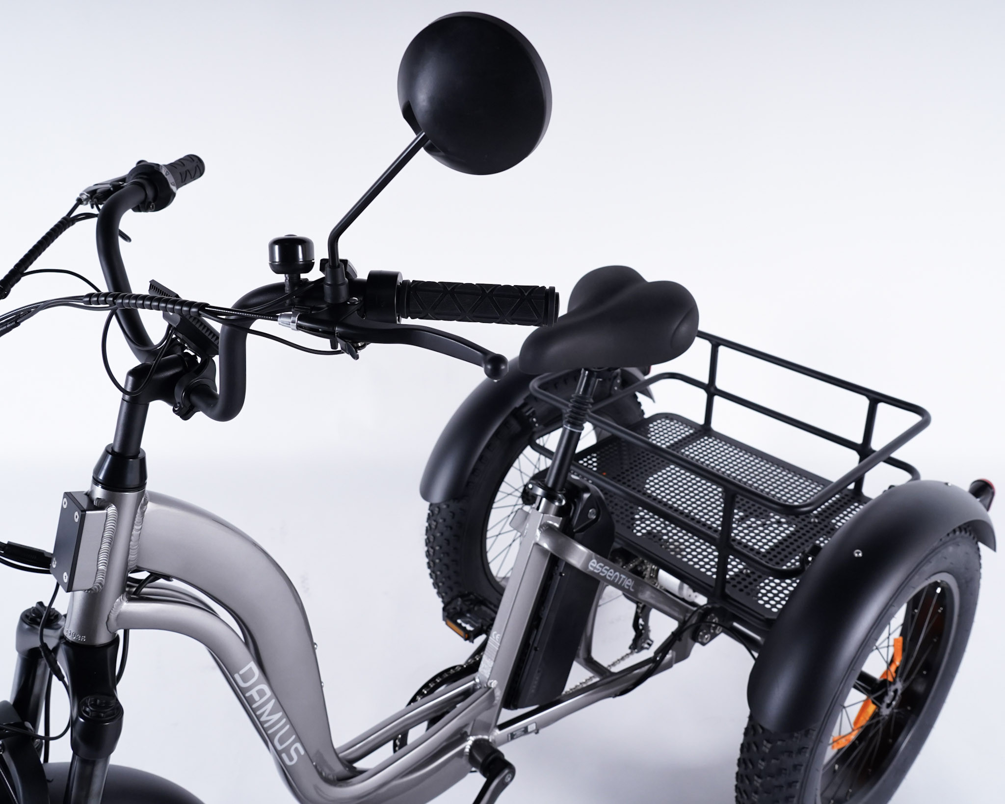Voici la version FATBIKE du tricycle adulte électrique ESSENTIEL :) D'une grande qualité de fabrication et parfaitement équipé, le tricycle Essentiel Fatbike est équipé d'origine d'une assistance électrique progressive, facile à utiliser et puissante lorsqu'il le faut grâce au moteur Bafang 45Nm placé dans la roue avant. Il bénéficie d'une position de conduite confortable et adaptée même si vous avez des problèmes articulaires, d'un éclairage alimenté par la batterie avec fonction feu stop lorsque vous freinez, de freins à disque avec position parking, d'une fourche avec suspension ainsi que d'une selle confortable et suspendue. Dans le grand panier arrière vous pourrez choisir en option différents accessoires comme une housse isotherme ou un sac de transport pour votre animal de compagnie !